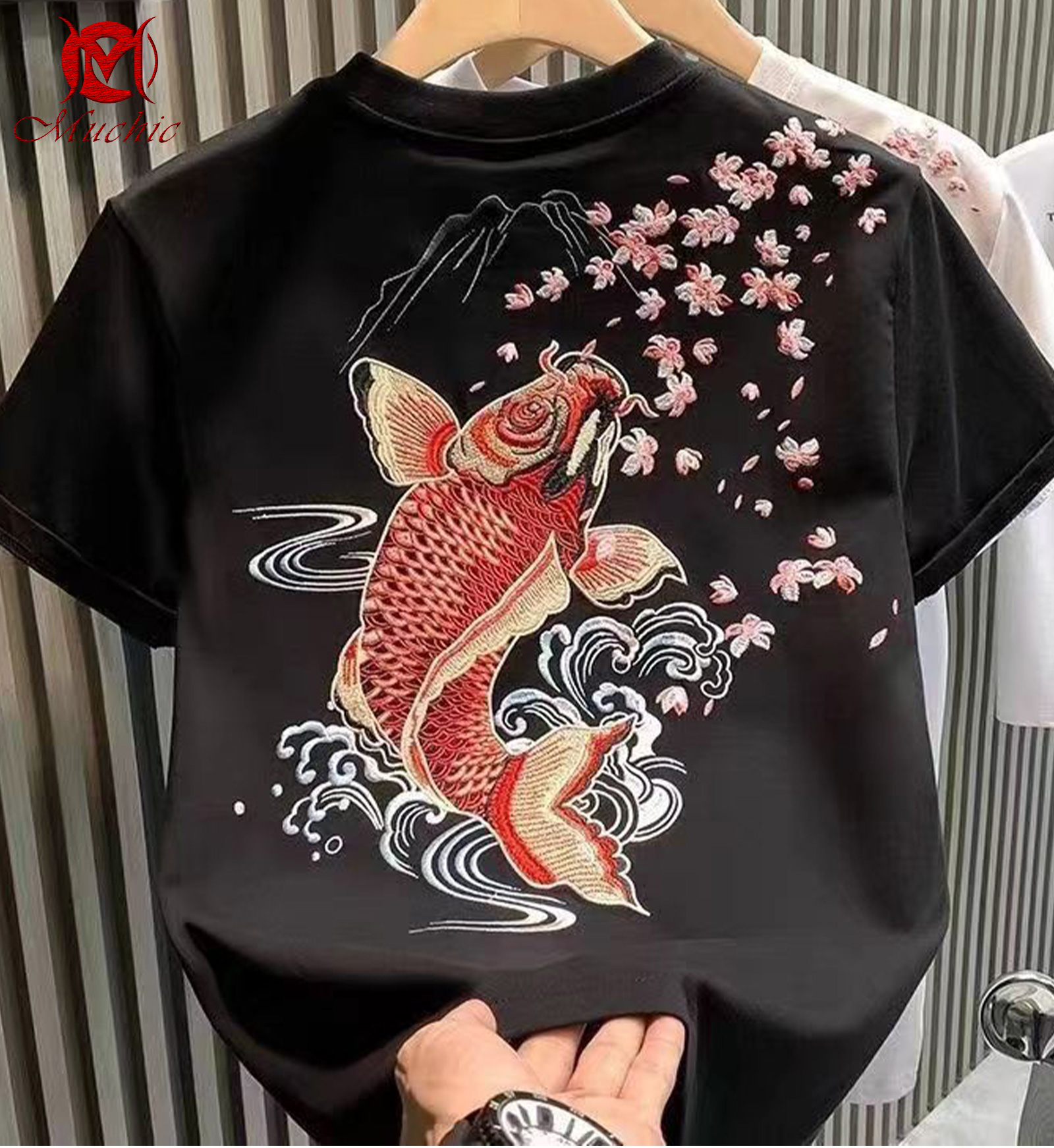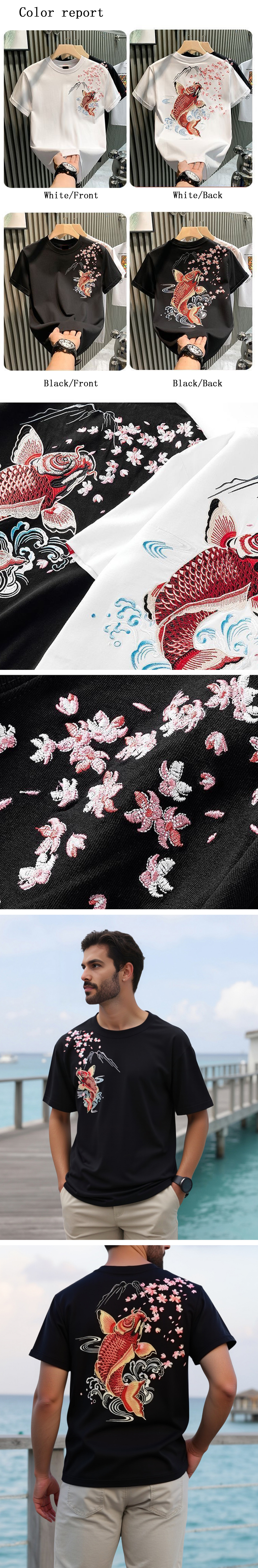 Unisex Intangible Cultural Heritage Goldfish and Cherry Blossom Embroidered T-shirt (Hand-embroidered) (Duty Free)